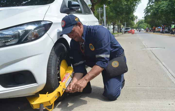 Cartagena de Indias, D. T. y C.,17 de octubre de 2024. La Alcaldía Mayor de Cartagena, a través del DATT, continúa en la guerra contra el mal parqueo. En Parque Heredia, los vehículos mal parqueados en vía pública fueron bloqueados por la patrulla.