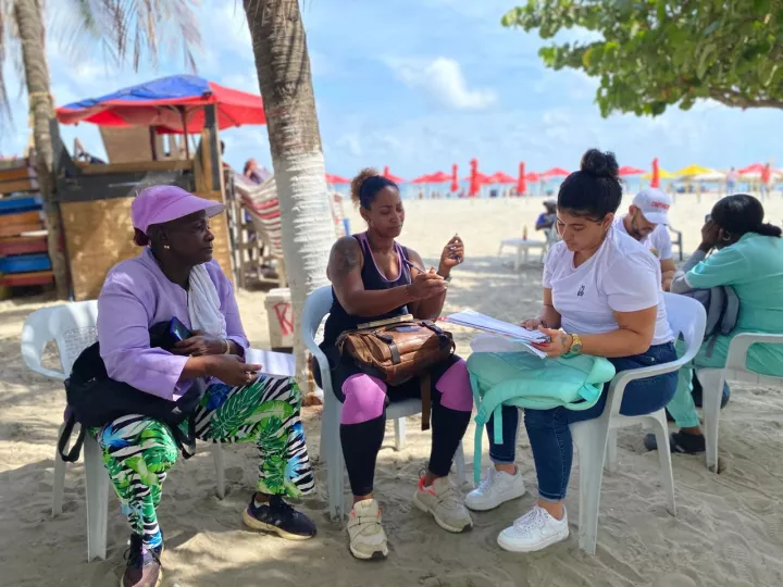 Cartagena de Indias D. T. y C., 21 de junio de 2024. Bajo las directrices del alcalde Dumek Turbay Paz de recuperar el brillo y el esplendor del turismo de la ciudad, el gobierno distrital, a través del Plan de Emergencia Social- Pedro Romero, se trasladó hasta Bocagrande para realizar la primera jornada de caracterización a las asociaciones de masajistas y peinadoras de las playas, con miras a priorizar acciones en beneficio de estas personas.