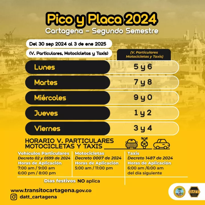 El pico y placa de los taxis en esta rotación irá hasta el 03 de enero del 2025, en el horario comprendido entre las 6:00 am y las 6:00 am del día siguiente, de lunes a viernes, en todas las vías del Distrito de Cartagena de Indias, así: