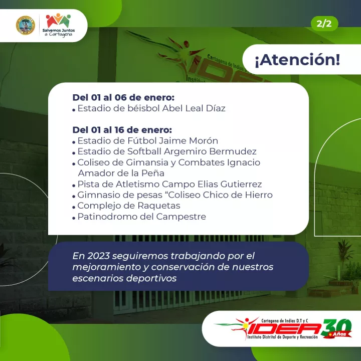 Cartagena de Indias D.T. y C., diciembre 29 del 2022. Algunos de los escenarios deportivos del Distrito, administrados por el Instituto de Deporte y Recreación -IDER, serán cerrados entre el 01 y el 16 de enero próximo, para desarrollar trabajos contemplados en el Plan de Mejoramiento, adecuación y conservación de 2023.