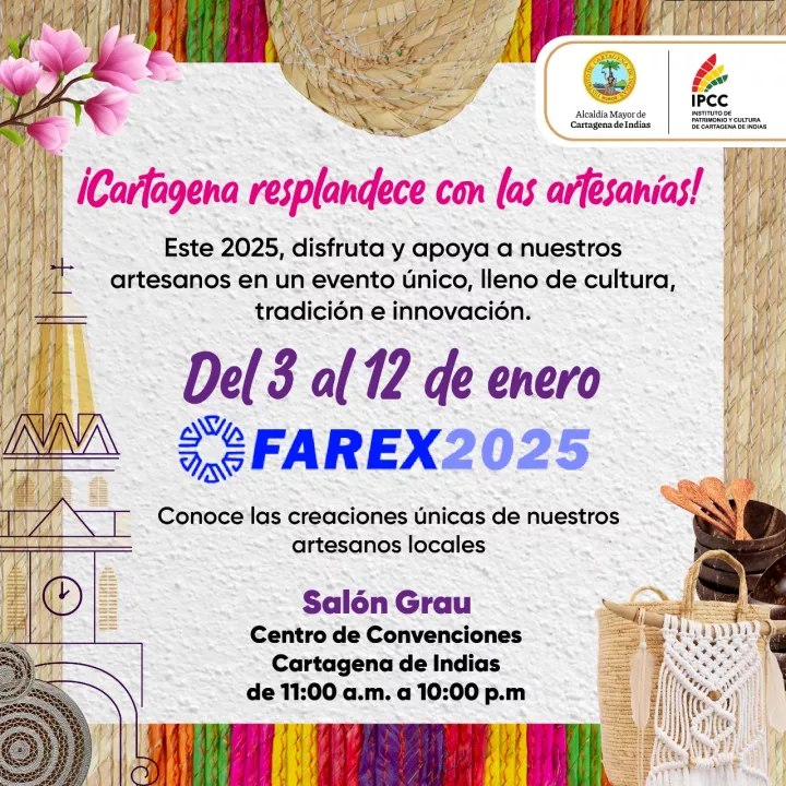 Cartagena de Indias, D, T y C. 18 artesanos de la ciudad se darán cita del 3 al 12 de enero de 2025, en la feria FAREX, uno de los mercados culturales, económicos, creativos e innovadores más importantes del país, y que se llevará a cabo en el Centro de Convenciones de Cartagena.