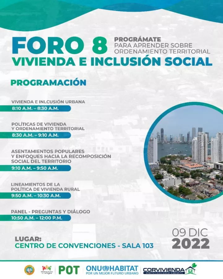 Cartagena de Indias D. T. y C., 6 de diciembre de 2022. El próximo 9 de diciembre, la Secretaría de Planeación Distrital realizará el Foro 8 del Seminario del Plan del Ordenamiento Territorial, espacio que se desarrolla en el marco de la alianza entre la Alcaldía de Cartagena y ONU-Habitat. El evento se realizará de forma presencial en el Centro de Convenciones, sala 103, a partir de las 8:00 a.m.