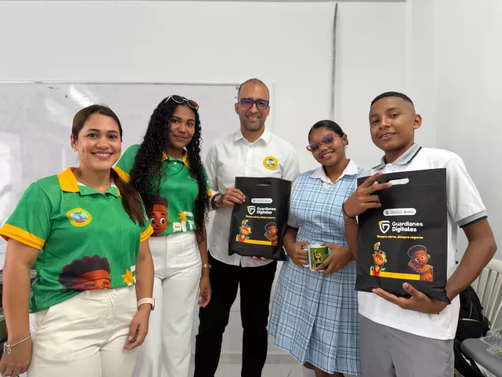 “Hoy estuvimos en la institución educativa Manuela Beltrán, donde la Alcaldía de Cartagena, a través de la Oficina Asesora de Informática hizo acompañamiento con la línea de acción de Guardianes Digitales, una estrategia que busca fortalecer el uso responsable y seguro de la tecnología en nuestros jóvenes y niños”, indicó Wendy Macea, integrante de la estrategia Guardianes digitales.
