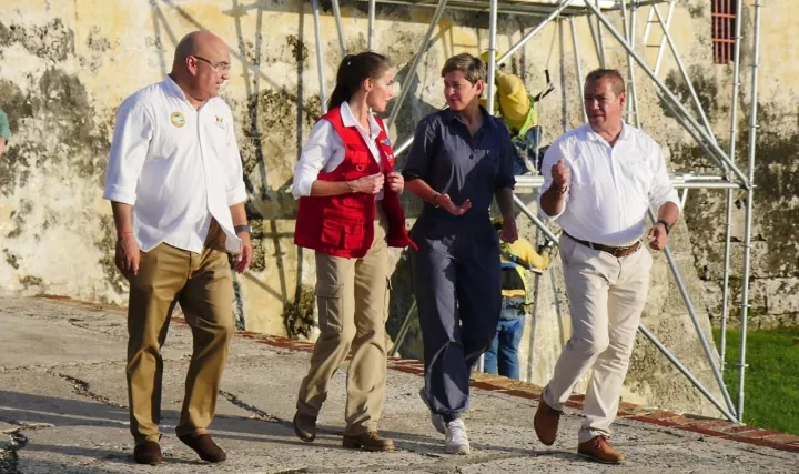 Funcionarios de la Escuela Taller, junto a la Reina de España, finalizaron la actividad en el Baluarte de Santa Catalina, evidenciando los trabajos de mantenimiento y limpieza de las murallas, que realizan los estudiantes de la Escuela Taller Cartagena de Indias.