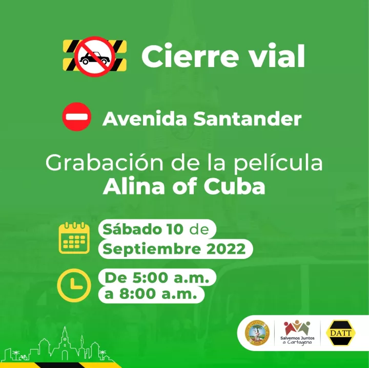El Departamento Administrativo de Tránsito y Transporte, DATT, informa que este sábado 10 de septiembre se realizarán cierres intermitentes en la Avenida Santander, entre el Parque de la Marina y Las Tenazas, en ambas calzadas (sentido Bocagrande – Crespo y Crespo – Bocagrande), entre las 5:00 a.m. y 8:00 a.m.