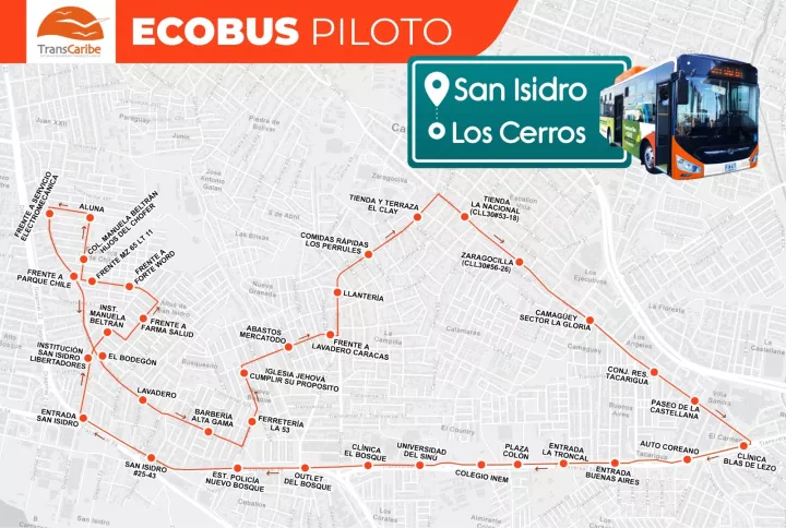 San Isidro – Los Cerros es la sexta ruta experimental en la que se hacen pruebas con el Ecobús Piloto. Ya se testearon los recorridos Aeropuerto – Laguito, Bodeguita – Pie de la Popa – Manga, Nuevo Bosque – Ejecutivos, Terminal del sur – Bayunca – Pontezuela – Terminal del norte, y Portal – Parque Heredia.