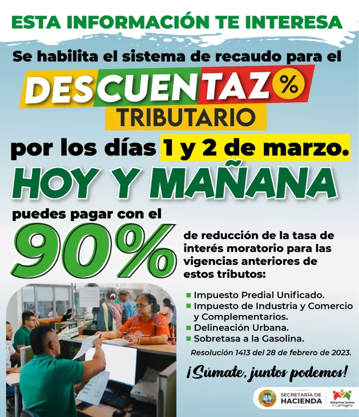 Cartagena de Indias D. T. y C; 1 de marzo de 2023. Dada una contingencia técnica presentada en los servicios informáticos el 27 y 28 de febrero, la Secretaría de Hacienda, mediante Resolución 1413 del 28 de febrero de 2022, habilita este 1 y 2 de marzo, el Sistema de Recaudo Tributario para garantizar la aplicación efectiva de los beneficios fijados en el Acuerdo Distrital número 100 de 2022, “Por medio del cual se establece de manera transitoria un beneficio de reducción en la tasa de interés moratorio aplicable a las deudas tributarias, multas de tránsito y se dictan otras disposiciones”.