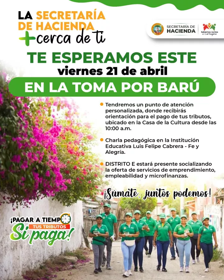 Cartagena de Indias D.T y C; 20 de abril de 2023. Mañana, viernes 21 de abril, la Secretaría de Hacienda de Cartagena, se toma la Isla de Barú para llevar a la comunidad toda su oferta de servicios.