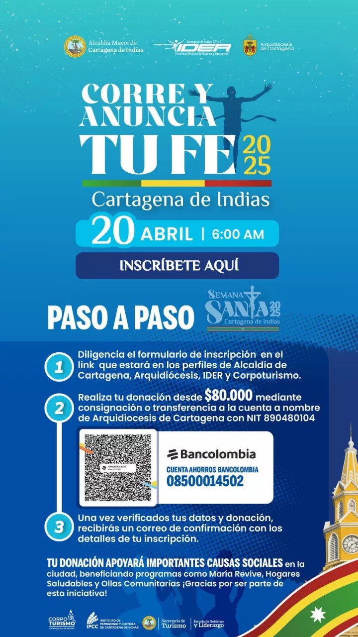 Cartagena de Indias D. T. y C., 8 de abril de 2025. Continúan abiertas las inscripciones para participar de la carrera “Corre y anuncia tu fe”, en las modalidades de 5 y 10 k, la cual se realizará el Domingo de Pascua, 20 de abril, desde las 6:00 a.m., en el Centro Histórico de Cartagena.