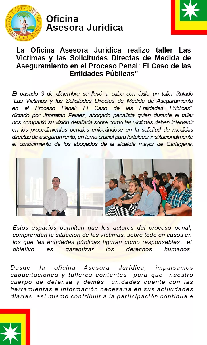 El pasado 3 de diciembre se llevó a cabo con éxito un taller titulado "Las Víctimas y las Solicitudes Directas de Medida de Aseguramiento en el Proceso Penal: El Caso de las Entidades Públicas" , dictado por el Jhonatan Peláez, abogado penalista quien durante el taller nos compartió su visión detallada sobre como las víctimas deben intervenir en los procedimientos penales enfocándose en la solicitud de medidas directas de aseguramiento, un tema crucial para fortalecer institucionalmente el conocimiento de los abogados de la alcaldía mayor de Cartagena.