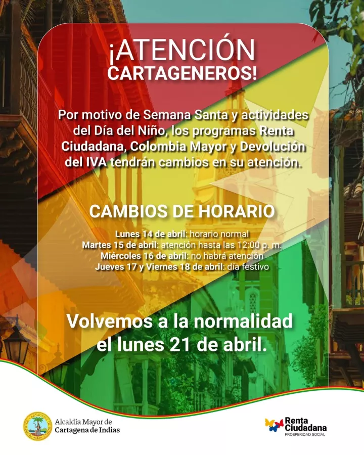 Cartagena de Indias, D. T. y C., 10 de abril de 2025. Los programas Renta Ciudadana, Colombia Mayor y Devolución del IVA informan a la ciudadanía que, con motivo de la Semana Santa y la programación de actividades institucionales, se realizarán modificaciones temporales en los horarios de atención en los puntos habilitados.