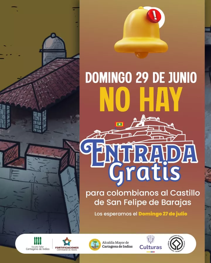 Por otro lado, la Escuela Taller Cartagena de Indias (Etcar), administradora de las fortificaciones de la ciudad, recuerda a los cartageneros y visitantes que este domingo 29 de junio no se realizará jornada de entrada gratis para colombianos, dado que la actividad se llevó a cabo el domingo 1 de junio en celebración del cumpleaños 492 de la ciudad. El próximo día de entrada gratuita para nacionales será el domingo 27 de julio.
