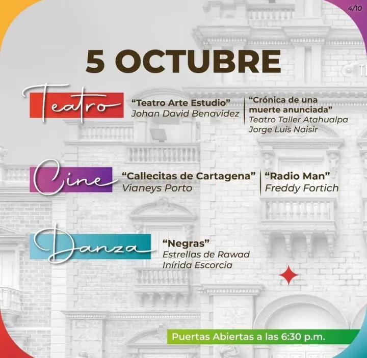 El miércoles 5 de octubre, el grupo de danzas Estrellas de Rawad realizará su puesta en escena “Negras”; la cuota de teatro será de Johan David Benavidez con “Teatro arte estudio”, y el Teatro Taller Atahualpa- Jorge Luis Naisir-, con “Crónica de una muerte anunciada”.