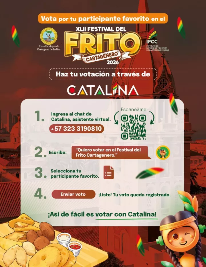 El alcalde de Cartagena, Dumek Turbay Paz, instó a ser partícipes de esta gran fiesta gastronómica, “los invito a vivir y disfrutar el Festival del Frito Cartagenero y a ser protagonistas de esta tradición votando por su mesa favorita a través de la App Catalina. Su participación reconoce el talento de nuestros cocineros y fortalece nuestra cultura. Disfruten, saboreen y voten”.