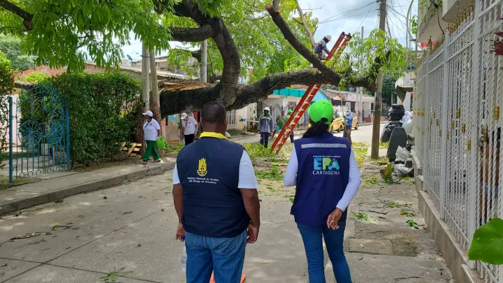 Cartagena de Indias D. T. y C., 3 de julio de 2024. Un equipo técnico conformado por el Establecimiento Público Ambiental (EPA Cartagena), la Oficina Asesora de Gestión del Riesgo de Desastres del Distrito (OAGRD), el Departamento Administrativo de Tránsito y Transporte (DATT) y la empresa Afinia logró atender la situación de riesgo que representaba para la comunidad el mal estado de un gran árbol, de especie bonga, en el barrio Ternera.