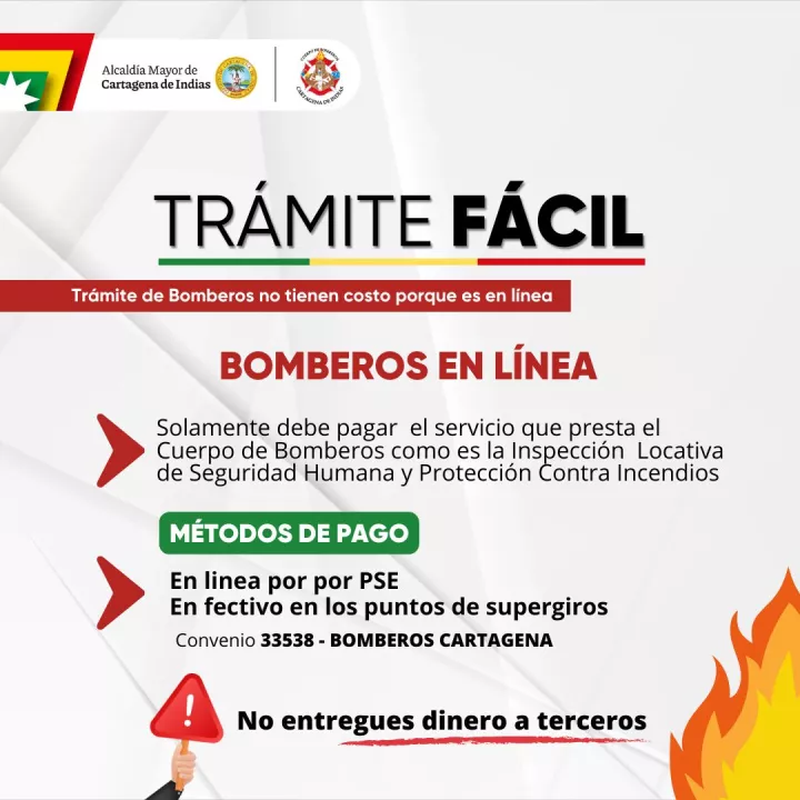 Cartagena de Indias, viernes 23 de agosto del 2024. El Cuerpo de Bomberos de Cartagena recuerda a la comunidad que los trámites relacionados con la Inspección Locativa de Seguridad Humana y Protección Contra Incendios no tienen costo adicional, ya que se realizan completamente en línea a través de la plataforma SIGOB. El único pago que debe realizarse corresponde al servicio prestado por el Cuerpo de Bomberos, el cual puede efectuarse de manera segura a través de PSE o en efectivo en los puntos de Supergiros utilizando el convenio 33538 - BOMBEROS CARTAGENA.