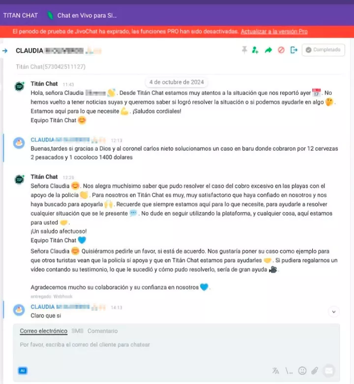 Tras el reporte del caso de cobro abusivo, se logró evitar la estafa gracias a la rápida intervención de las autoridades luego del monitoreo a través de Titán Chat.