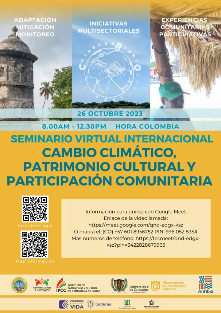 Cartagena de Indias D. T. y C; 22 de octubre de 2023. El Instituto de Patrimonio y Cultura de Cartagena (IPCC) recuerda a la ciudadanía, que hasta el 25 de octubre estarán abiertas las inscripciones para el Seminario Virtual Internacional “Cambio climático, patrimonio cultural y participación comunitaria”, que se realizará el jueves 26 de octubre de 8:00 de la mañana a 12:00 del medio día.