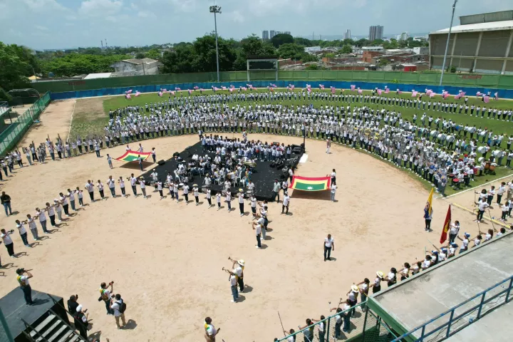 En ese emblemático escenario deportivo, las bandas se ubicaron alrededor de la tarima y dieron paso a una sentida concentración musical que entonó a todo pulmón y el corazón los himnos de Colombia y Cartagena, en compañía de la voz de la señorita Bolívar, Andrea Vásquez.