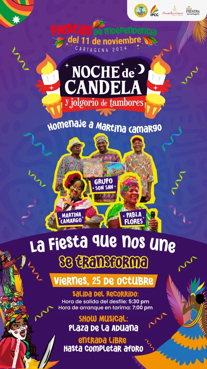 La directora del Instituto de Patrimonio y Cultura de Cartagena de Indias (IPCC), Lucy Espinosa, destacó que "la Noche de Candela y Jolgorio de Tambores y Cantadoras rendirá homenaje a la cantadora de tambora del sur de Bolívar, Martina Camargo, quien está nominada al Grammy Latino por su álbum 'Canto y río'; y homenaje póstumo al maestro y Gran Lancero Giovanny Barandica. Voces, ritmos y sones de nuestro Caribe se unirán a esta fiesta, a la que todos están cordialmente invitados".
