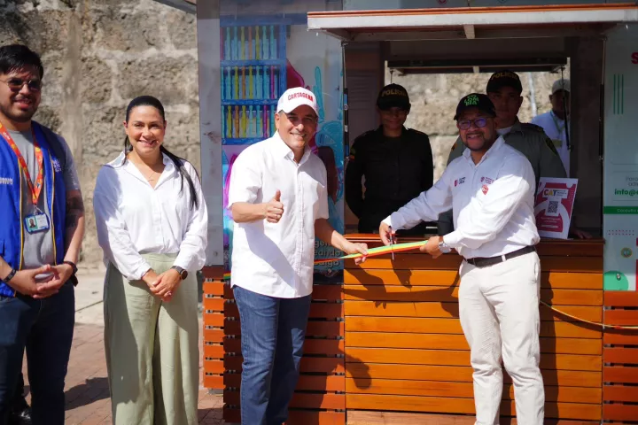 Cartagena de Indias D. T. y C., 6 de enero de 2024. El alcalde mayor de Cartagena, Dumek Turbay Paz, acompañó este sábado la puesta en marcha de cinco Centros de Atención al Turista, CATS, ubicados en diferentes puntos de la ciudad, donde los visitantes podrán encontrar la información necesaria sobre oferta turística, tarifas y lugares seguros para visitar.