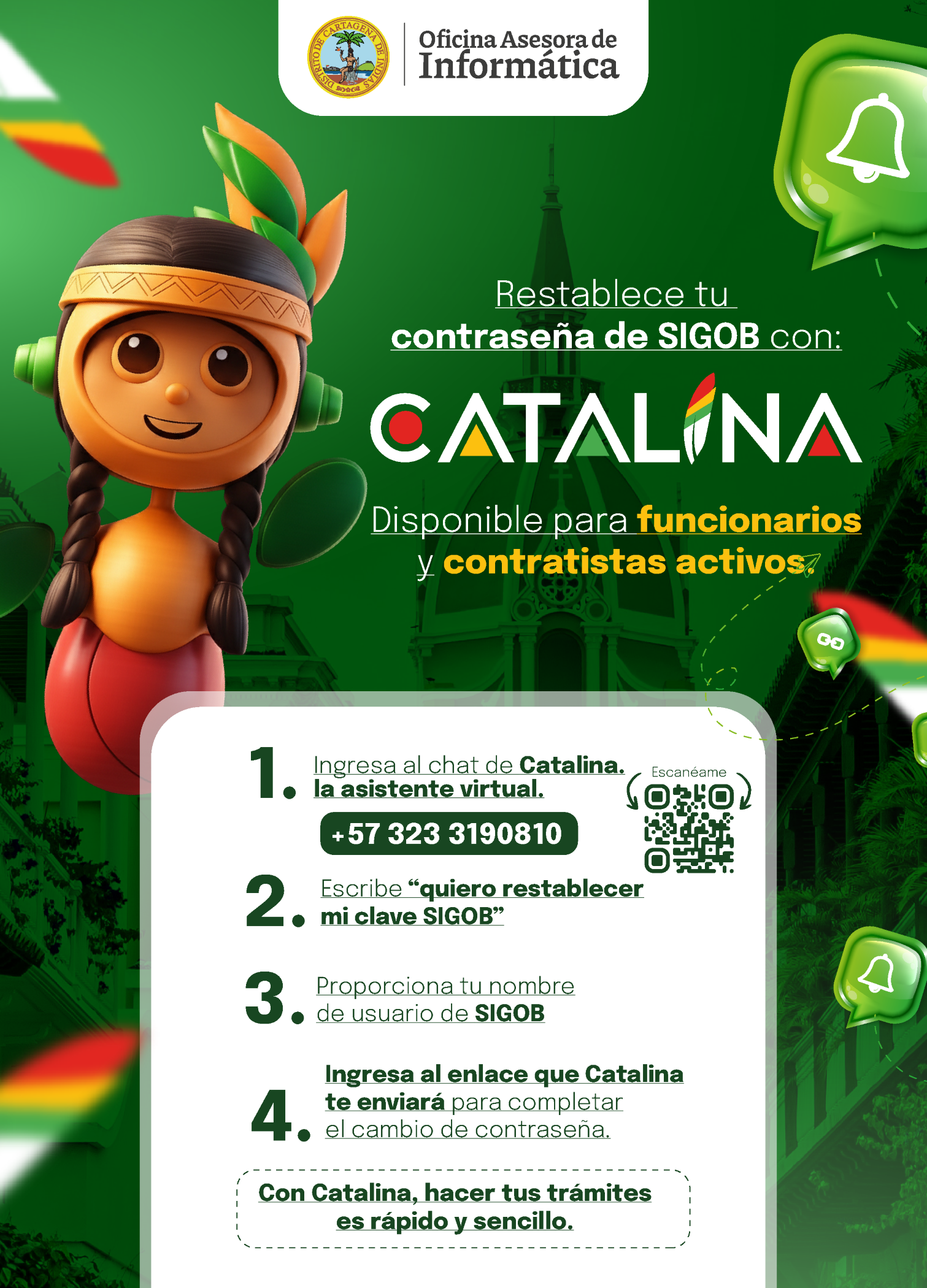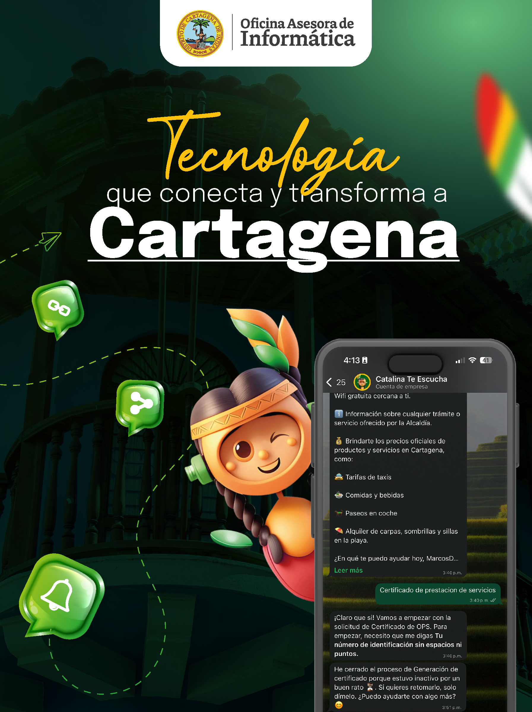 Con Catalina, conectarte con los servicios públicos de Cartagena nunca ha sido tan fácil. Descubre una forma más ágil, eficiente y accesible de interactuar con la administración distrital.